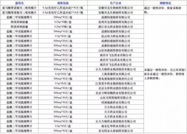其中,安徽贝克生物制药有限公司的富马酸替诺福韦二吡呋酯片因通过一致性评价而恢复采购资格——其在2018年8月10日,因未通过一致性评价而被江西省暂停采购资格。