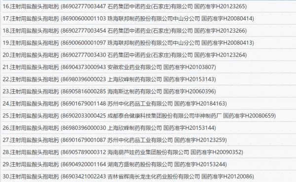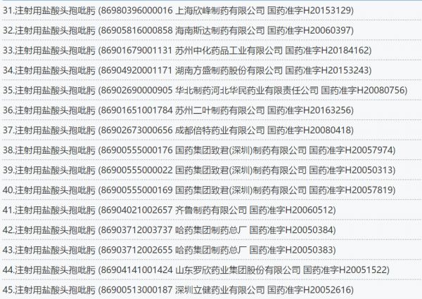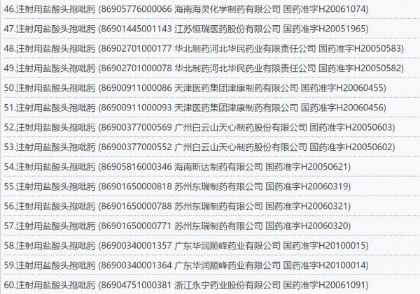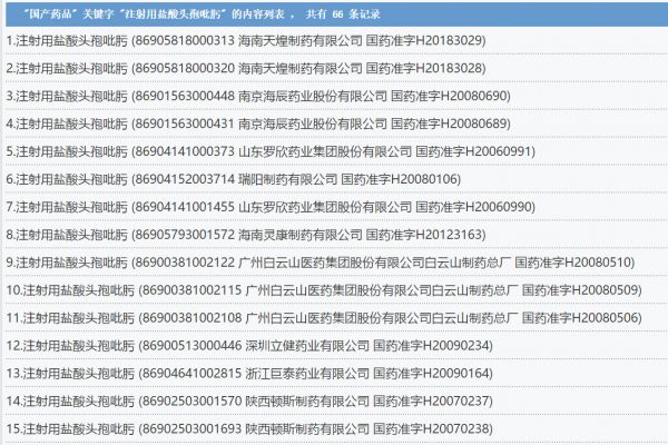 据在国家药监局网站查询,注射用盐酸头孢吡肟共66个药品批文,涉及江苏恒瑞、南京海辰、广州白云山、华北制药、国药集团、齐鲁制药、哈药集团、深圳信立泰等知名药企。