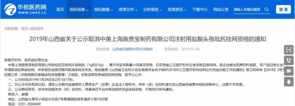 1月28日,山西省药械集中竞价采购网发布《2019年山西省关于公示取消中美上海施贵宝制药有限公司注射用盐酸头孢吡肟挂网资格的通知》(以下简称(通知))。