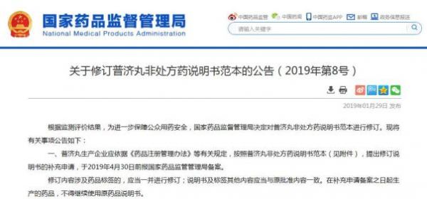 29日,国家药监局发布了《关于修订普济丸非处方药说明书范本的公告》(2019年第8号),称根据监测评价结果,为进一步保障公众用药安全,决定对普济丸非处方药说明书范本进行修订。