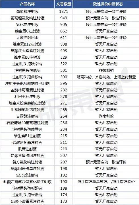 已上市的注射剂中,批文数前30的产品中,预计无需启动一致性评价的产品有5个,已启动一致性评价申请的仅4个,分别为注射用头孢他、注射用头孢曲松钠、甘露醇注射液和乳酸左氧氟沙星氯化钠注射液。