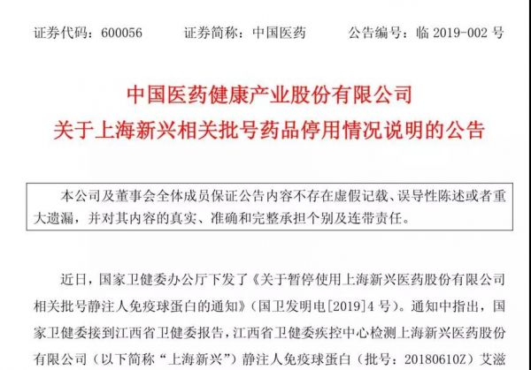 2月10日,中国医药发布公告,对其下属控股子公司上海新兴静注人免疫球蛋白事件作出说明。
