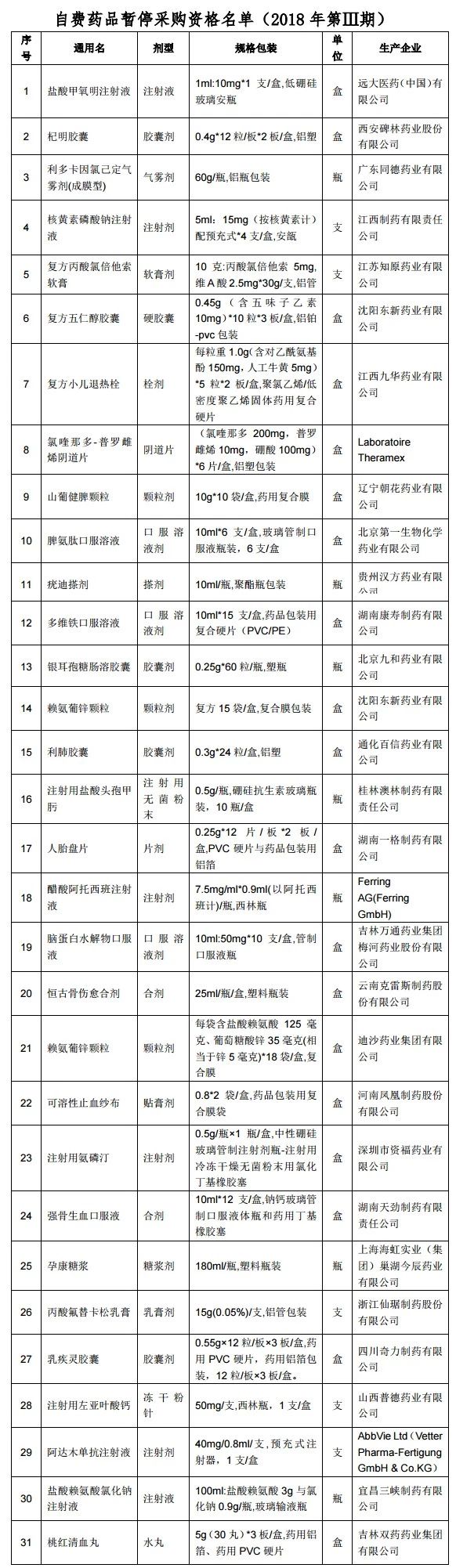 由此,自2019年2月11日起,31个药品不符合自费药品挂网相关规定药品进行暂停挂网采购资格一年。如下图: