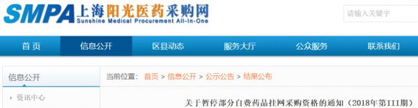同期,上海阳光采购网发布《关于暂停部分自费药品挂网采购资格的通知(2018年第III期)》。