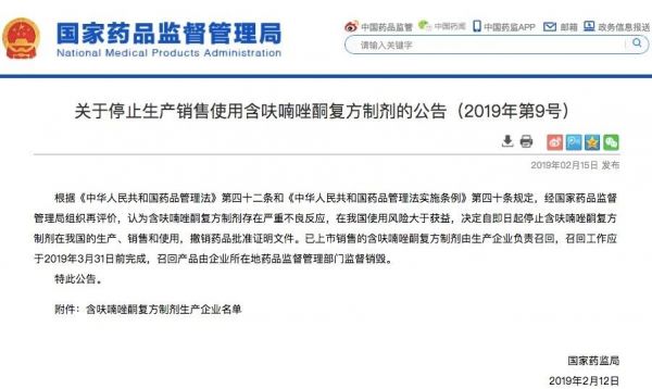 据公告,根据《中华人民共和国药品管理法》第四十二条和《中华人民共和国药品管理法实施条例》第四十条规定,经国家药品监督管理局组织再评价,认为含呋喃唑酮复方制剂存在严重不良反应,在我国使用风险大于获益,决定自即日起停止含呋喃唑酮复方制剂在我国的生产、销售和使用,撤销药品批准证明文件。 已上市销售的含呋喃唑酮复方制剂由生产企业负责召回,召回工作应于2019年3月31日前完成,召回产品由企业所在地药品监督管理部门监督销毁。