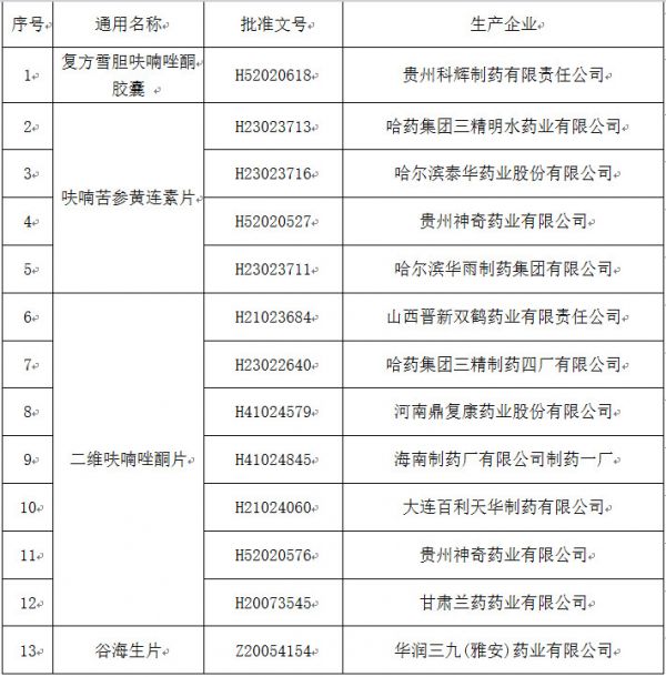 从公告附件可以看到,含呋喃唑酮的复方制剂共4个,分别是复方雪胆呋喃唑酮胶囊、呋喃苦参黄连素片、二维呋喃唑酮片、谷海生片,涉及13家药企,如哈药、华润三九等。
