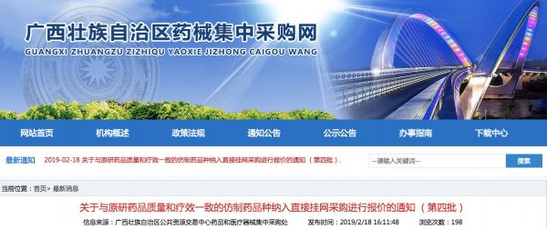 2月18日,广西药械集中采购网发布《关于与原研药品质量和疗效一致的仿制药品种纳入直接挂网采购进行报价的通知(第四批)》。
