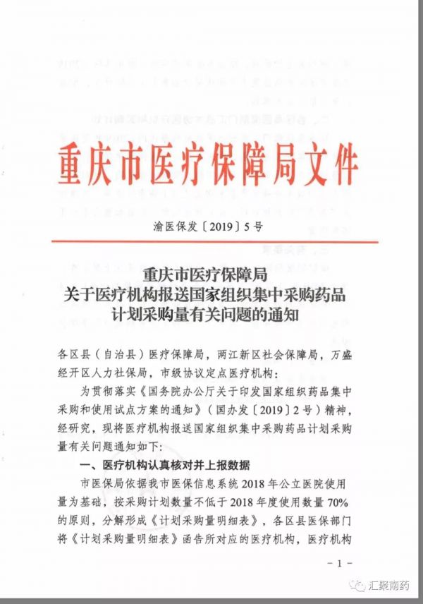 据汇聚南药消息,近日,重庆市医保局发出通知,要求上报国家组织集中采购计划量。