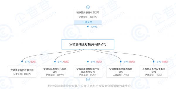 根据“企查查”提供的“股权穿透图”,安徽鲁瑞医疗投资有限公司由上市公司瑞康医药股份有限公司100%控股,认缴金额2000万。