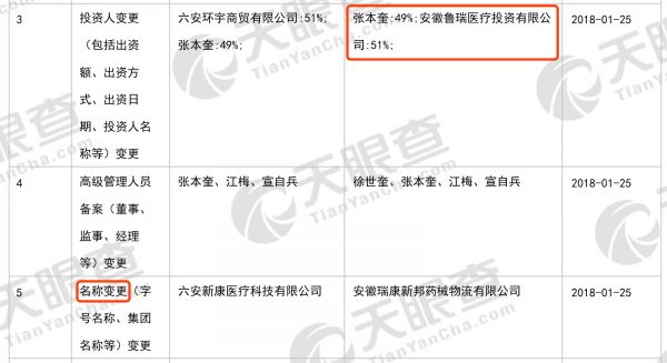 天眼查数据显示,2018年1月25日,安徽瑞康新邦的投资人股权关系由变更为:“张本奎:49%;安徽鲁瑞医疗投资有限公司:51%。