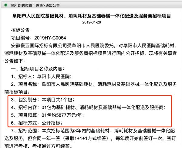 2019年1月28日,阜阳市人民医院发布以上项目的招标公告。招标项目内容显示,阜阳市人民医院基础耗材、消耗耗材及基础器械一体化配送及服务商招标项目共划分1个包“01”,项目预算为“01”包约5877万元/年。