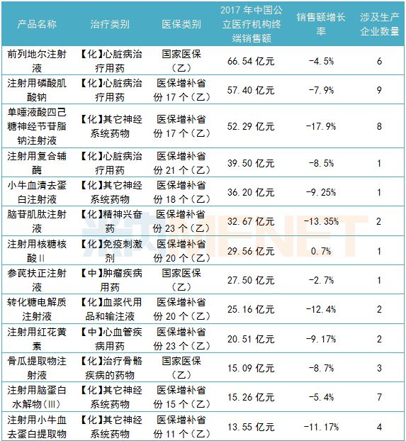2月24日,央视焦点访谈播放了《辅助用药,从滥用到规矩用》专题,提到安徽是国家深化医改综合试点省之一,2015年12月29日发布了《关于成立安徽省县级公立医院临床路径管理指导中心的通知》和相关实施方案,方案强调要在临床路径的管理中“加强辅助用药管理”,规定21种辅助药物不能纳入临床路径表单。据米内网数据显示,这21个辅助用药中有16个在2017年中国城市公立医院、县级公立医院、城市社区中心及乡镇卫生院(简称中国公立医疗机构)终端销售额超过10亿元,其中前列地尔注射液、注射用磷酸肌酸钠、单唾液酸四己糖神经节苷脂钠注射液、注射用复合辅酶、小牛血清去蛋白注射液以及脑苷肌肽注射液的公立医疗机构终端销售额更是高达30亿元以上。