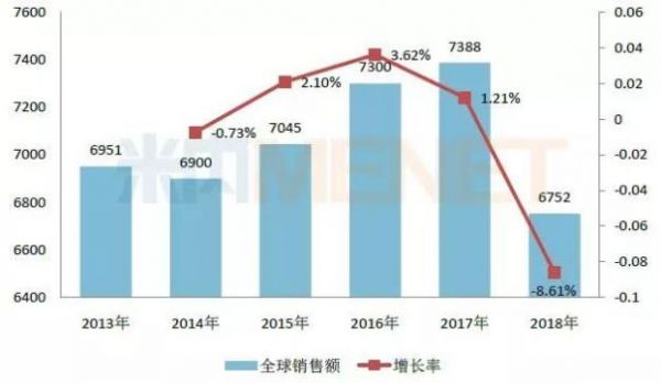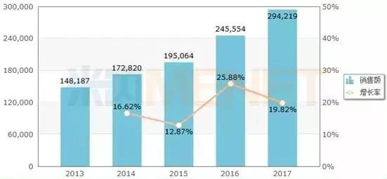 (来源:米内网跨国公司业绩库) 作为罗氏单抗三大巨头之一,利妥昔单抗连续多年跻身全球畅销药品排行榜TOP10,虽然该产品在欧洲专利保护期已于2014年底到期,面临着生物类似药的冲击,但2015-2017年其全球销售额仍呈现稳步上升的态势,2017年实现全球销售额73.88亿瑞士法郎,同比去年增长1.21%,在2017年全球畅销药品排行榜中排位第五。 2019年2月1日,罗氏公布2018年财报,集团全年实现收入568.46亿瑞士法郎,同比去年增长7%,其中制药业务收入439.67亿瑞士法郎,占集团总收入77.34%。随着利妥昔单抗在各国的专利陆续到期,越来越多的生物类似药获批上市造成冲击,2018年罗氏的利妥昔单抗全球销售额仅为67.52亿瑞士法郎,同比去年下滑8.61%,其中在欧洲市场收入同比去年下滑47%。 图2:2013-2017年中国公立医疗机构终端利妥昔单抗注射液销售情况(单位:万元)