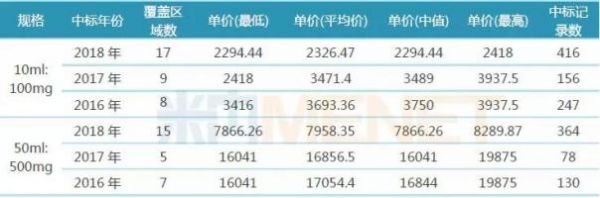 2017年7月,罗氏的利妥昔单抗通过医保谈判进入2017年版国家医保目录,10ml:100mg、50ml:500mg规格的美罗华医保支付标准分别为2418元/瓶、8289.87元/瓶,据米内网中国药品招投标数据库,2017年10ml:100mg、50ml:500mg规格的美罗华平均中标价分别为3471.4元/瓶,16856.5元/瓶;2018年,各省开展抗癌药专项集中采购,美罗华价格进一步降低,据米内网中国药品招投标数据库,2018年10ml:100mg、50ml:500mg规格的美罗华平均中标价分别为2326.47元/瓶,7958.35元/瓶。
