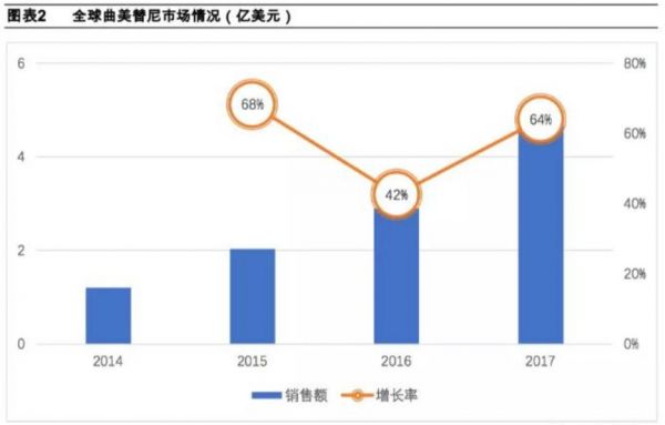 根据药物综合数据库(PDB)显示,2014-2017年曲美替尼则一直保持高速增长,2017年全球销售额近5亿美元,增长率在2016年经历了一个较大波动后,2017年又恢复了64%的高速增长。