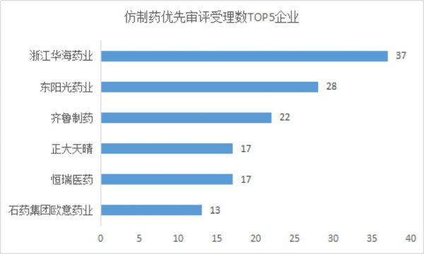 拥有首仿产品、贡献产品儿童用药、与现有治疗手段相比具有明显治疗优势药品等理由的仿制药会列入优先审评审批,目前的仿制药受理号总计315个,浙江华海、东阳光药业、齐鲁制药为申报企业TOP3。
