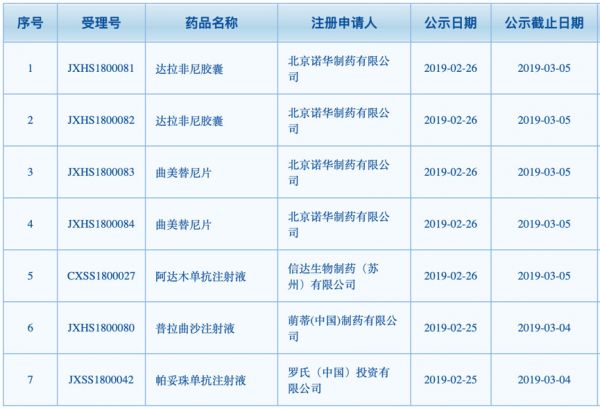 2月26日,国家药审中心拟纳入优先审评审批栏目下,增加了7个药品,共5个品种,包括北京诺华的达拉非尼胶囊和曲美替尼片、信达生物的阿达木单抗注射液、萌蒂制药的普拉曲沙注射液和罗氏的帕妥珠单抗注射液。