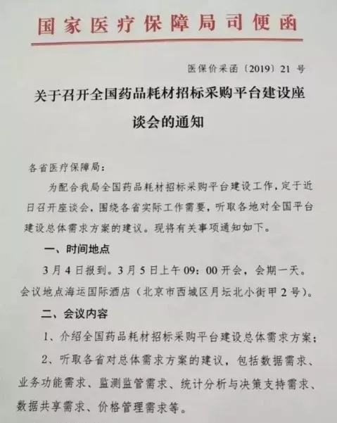 近日,业界流传一份国家医疗保障局的通知文件--《关于召开全国药品耗材招标采购平台建设座谈会的通知》,称为配合国家医保局全国药品耗材招标平台建设工作,各省围绕实际工作需要,对全国平台总体需求方案提出建议,座谈会定于3月5日全天。