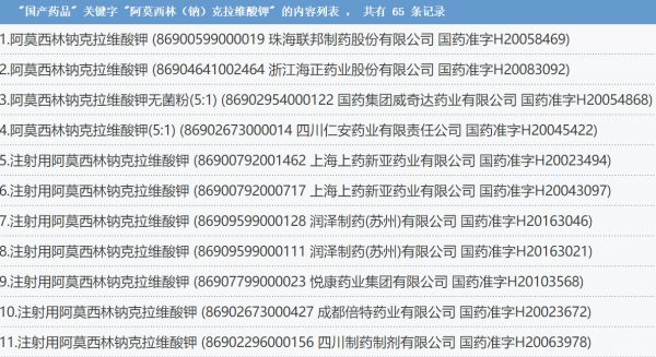 据赛柏蓝查询,阿莫西林(钠)克拉维酸钾制剂共有国产药品批文65个,涉及上药、国药、浙江海正等一众药企。