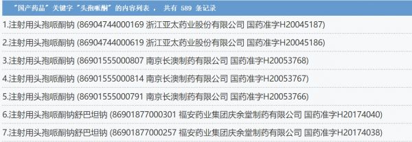 据赛柏蓝查询,含头孢哌酮药品共有国产药品批文589个,石药集团、广州白云山、国药集团、辅仁药业、辉瑞制药、哈药三精等知名药企均握有批文。
