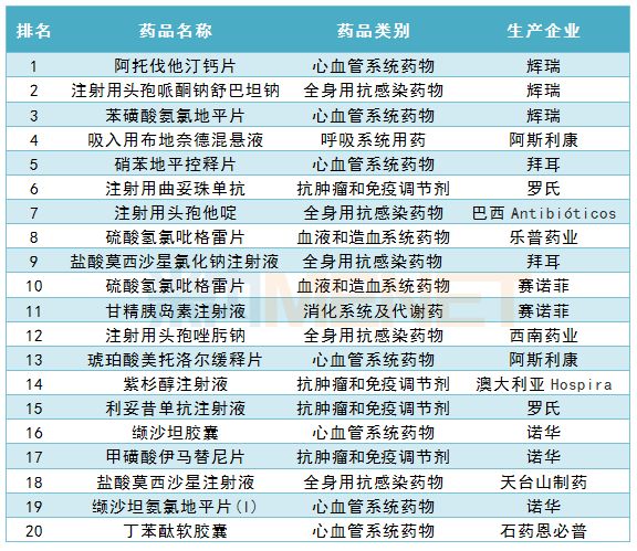 20个药品中,有16个药品的生产企业为外资企业。药品数量最多的生产企业辉瑞、诺华均有3个药品在列,辉瑞的3个药品阿托伐他汀钙片、注射用头孢哌酮钠舒巴坦钠、苯磺酸氨氯地平片更是称霸前三甲。据米内网数据,这20个药品多数是相关生产企业在中国公立医疗机构终端的主要销售品种。