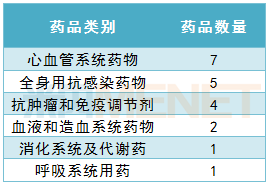 根据药品治疗类别,20个药品中有7个为心血管系统药物,全身用抗感染药物有5个,抗肿瘤和免疫调节剂有4个,血液和造血系统药物有2个,消化系统及代谢药和呼吸系统用药各有1个。