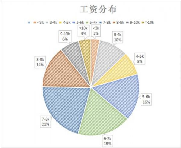 由下图所示:在收入占比中,55%的代表月收入都维持在5-8K,这一数据比去年的高出了10%+。而月薪在8-10K的代表占比相较于17年下降了4%,月薪在10K+的代表占比也较去年下降了6%。