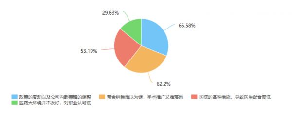 调查显示,60+%的医药代表认为政策导致公司内部策略的变动以及学术推广的难以落地事目前遇见的最大的难题;超过一半的药代认为当前医院预防带金销售的措施,给日常推广造成困扰。