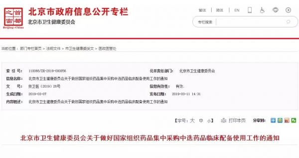 3月11日,北京市卫健委发布《关于做好国家组织药品集中采购中选药品临床配备使用工作的通知》(以下简称《通知》),对优先使用中选药品、提高中选药品合理使用水平、做好中选药品临床使用监测、狠抓行风建设等方面提出了具体要求。