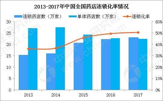 2014年以前,零售药店较为分散,从2014年开始,零售药店行业进入结构性调整阶段,单体药店的数量开始呈下降趋势,药店的连锁化率开始快速提升,药店行业发展从数量提升开始向集中度提升转型。2015年,单体药店数24.32万家,同比减少3.12万家,零售药店连锁化率45.7%。2017年,连锁药店数量首次超过单体药店数量,连锁药店22.92万家,单体药店22.45万家,连锁化率提高至50.5%。预计2018年单体药店规模进一步缩小,连锁药店规模继续扩大,连锁化率有望达到51.8%。因药店分类分级管理全国推广,2019年连锁药店率将进一步提高,有望达到54.1%。
