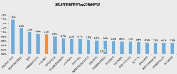 再来看看TOP20畅销产品,以慢病用药居多。例如阿托伐他汀钙片、硫酸氢氯吡格雷片、苯磺酸氨氯地平片等,都是市场需求非常大的慢病用药。值得一提的是,2018年人血白蛋白由于渠道的转移,成为县域药品渠道的新兴产品。