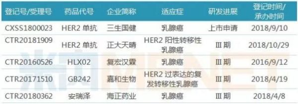 赫赛汀于2002年9月5日获得国家药监局批准进入国内市场,2017年以近70%的降幅进入医保,近几年来在中国公立医疗机构终端的销售情况良好,为罗氏的业绩提供了不小的增力。目前国内市场有超过10家企业在布局赫赛汀生物类似药,速度最快的是三生国健,其上市申请已于2018年9月10日获得CDE承办受理,并被纳入优先审评。此外,还有正大天晴、复宏汉霖、嘉和生物、海正药业的产品进入III期临床,适应症均为乳腺癌。