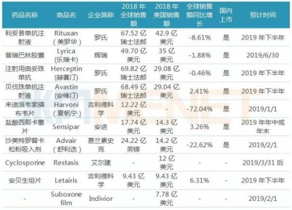 从FiercePharma发布的药品清单可看出,一半以上的药品预计会在2019年年中或下半年失去在美国市场的独占权;从2018年全球销售情况看,一半以上的药品出现销售额下滑的情况,随着专利到期,多个仿制药获批上市,其在2019年的销售将更加不容乐观;与此同时,一半以上的药品已成功进入中国国内市场,且有些药品取得了不错的销售额业绩,比如罗氏的“三驾马车”。