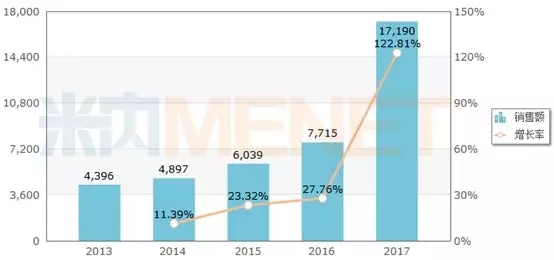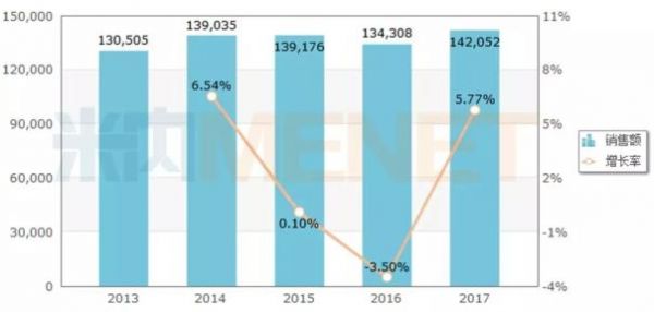 图1:2013-2017年中国公立医疗机构终端普瑞巴林销售情况(单位:万元)