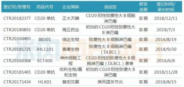 美罗华于2008年4月21日获得国家药监局批准进口,2017年该产品通过谈判降价进入医保,近几年来,美罗华在中国公立医疗机构终端销售额逐年看涨,2018年有望突破30亿元大关。据米内网中国药品临床试验公示库,目前国内有16家企业布局利妥昔单抗生物类似药,复星医药捷足先登,其申报的弥漫性大B细胞淋巴瘤适应症已获批上市,另一适应症类风湿关节炎也进行到临床III期,此外,正大天晴、海正药业、信达生物等6家企业针对弥漫性大B细胞淋巴瘤适应症的产品均已进入III期临床。