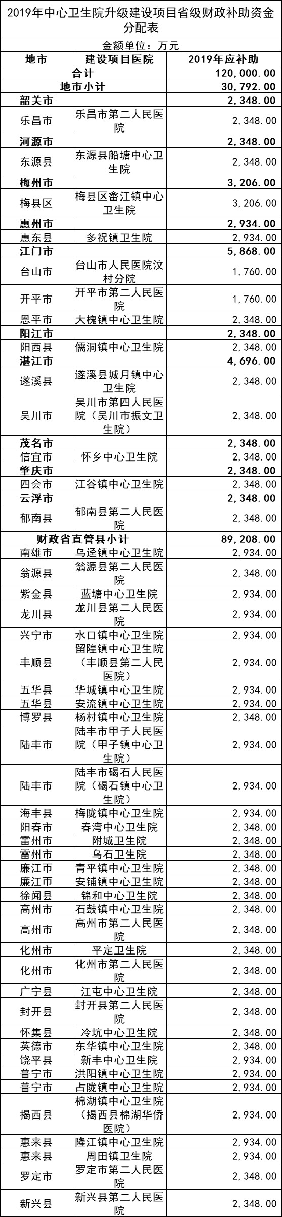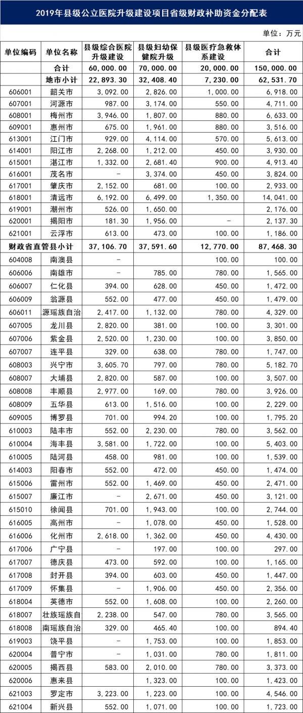 就在3月12日,广东省卫健委发布《关于2019 年医疗卫生健康事业发展专项资金分配方案及绩效目标表 (第一批)的公示》,其中同时发布了《2019年中心卫生院升级建设项目资金绩效目标表》和《2019年县级公立医院升级建设项目绩效目标表》。