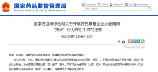 3月19日,国家药监局下发《国家药监局综合司关于开展药品零售企业执业药师“挂证”行为整治工作的通知》,内容提到3月15日晚,中央广播电视总台曝光了重庆市部分药品零售企业执业药师“挂证”、不凭处方销售处方药等问题,造成了恶劣社会影响。为全面落实药品监管“四个最严”要求,严厉打击执业药师“挂证”行为,将在全国范围内开展为期6个月的药品零售企业执业药师“挂证”行为整治。