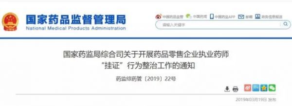 3月19日,国家药监局发布《关于开展药品零售企业执业药师“挂证”行为整治工作的通知》(以下简称《通知》),要求各省市监管部门严厉打击执业药师“挂证”行为,并于2019年9月30日前总结整治工作,报国家药监局药品监管司。
