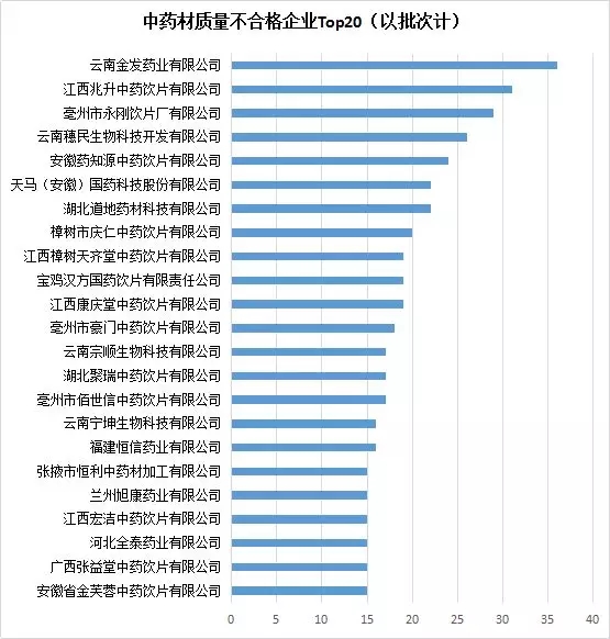 中药材不合格企业Top20中不合格中药材批次总计达458批次,占总中药材比例的19.20%。云南金发药业有限公司排名榜首,共36批次,其产品独活、茜草、钩藤、没药、地骨皮查出不合格批次较多;其次为江西兆升中药饮片有限公司,不合格数量达31批次,涉及产品主要为没药、白鲜皮、炒白芍等。此外,不合格中药材Top20企业同时也位列于药品质量不合格企业前Top20(按批次计)总排行榜中,侧面说明,中药材相关企业质量问题最为突出。