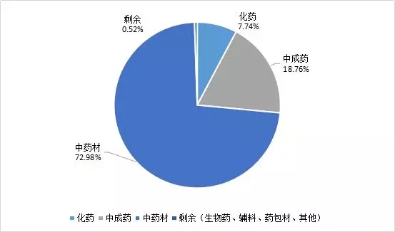 在2018年药品质量抽检不合格中,各类药物数量所占比例如下图所示。在3268批次不合格药品(不包括553批次假冒品)中,中药材共计2385批次,占比达72.98%,相比2017年减少了233批次,但占比却增长了14.03%。可见,中药材仍旧是国内市场不合格药品中最为突出的问题。