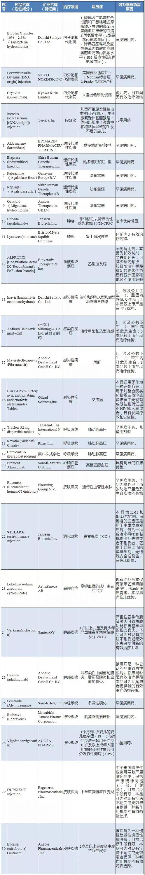 此次公示的30个品种中,大多都是罕见病、临床急需的特效药,其中包括百时美施贵宝的治疗肾上腺皮质癌的Lysodren,辉瑞治疗肺动脉高压的Revatio、赛诺菲治疗多发性硬化的Lemtrada等。
