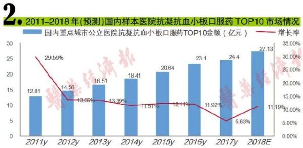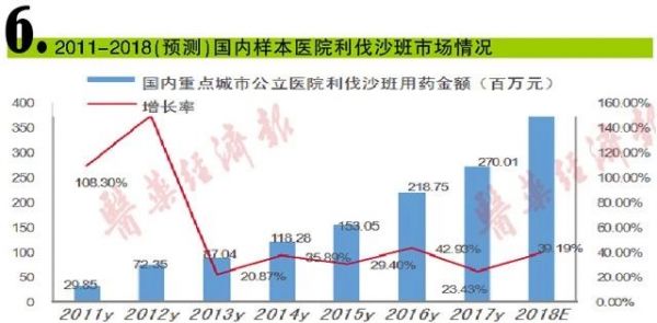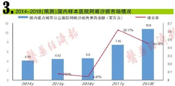 据米内网数据,2018年1-3季度国内重点城市公立医院利伐沙班用药金额为2.82亿元,预测全年将达3.76亿元,同比上一年增长近40%,国内医院总体市场将超过12亿元,是抗血栓形成药物中仅次于氯吡格雷片居第二位的药物。