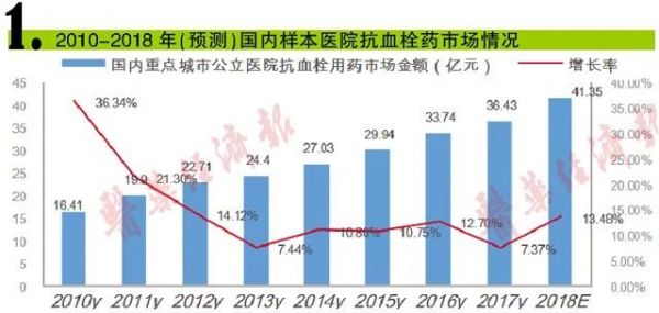 据米内网数据,2018年1-3季度国内重点城市公立医院抗血栓用药市场为30.86亿元,预测全年将达41.35亿元,同比上一年增长13.48%。