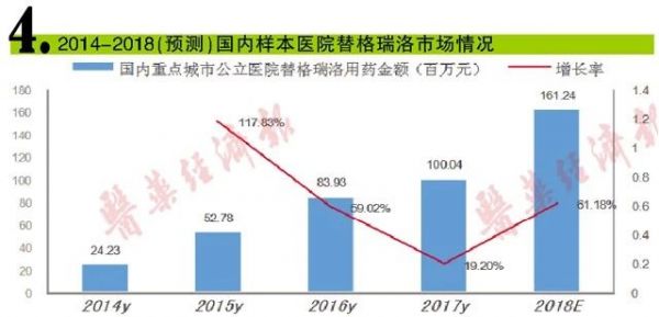据米内网数据,2018年1-3季度国内重点城市公立医院替格瑞洛用药金额为1.2093亿元,预测全年将达1.6124亿元,同比上一年增长61.18%,呈现出量价齐增的态势。