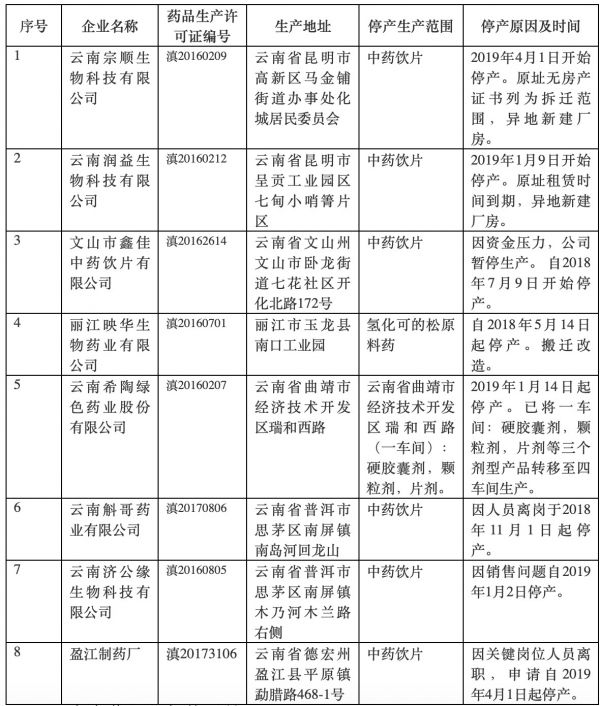 公告显示,近期云南省药监局收到部分药品生产企业的主动停产报告,现将相关企业主动停产情况公告如下: