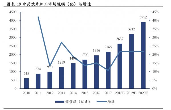 另一方面,据基业常青研究报告,国内饮片行业集中度非常低:国家统计局数据显示,2017年中药饮片加工市场规模达到2165亿元,行业龙头康美药业的中药饮片贡献营业收入61.6 亿元,而行业市占率仅为 2.8%。