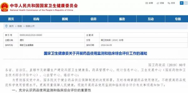 4月9日,国家卫健委官网发布《关于开展药品使用监测和临床综合评价工作的通知》(以下简称《通知》)要求,在全国各级公立医疗卫生机构中抽取不少于1500家机构,对药品使用与疾病防治、跟踪随访等相关数据进行重点监测。