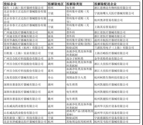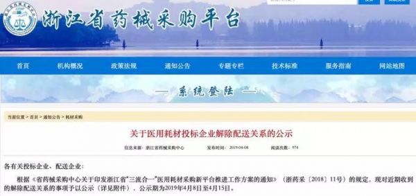 4月8日,浙江省药械采购平台发布《关于医用耗材投标企业解除配送关系公示》的通知,共解除了21家耗材企业配送关系,公示期为2019年4月8日至4月15日。