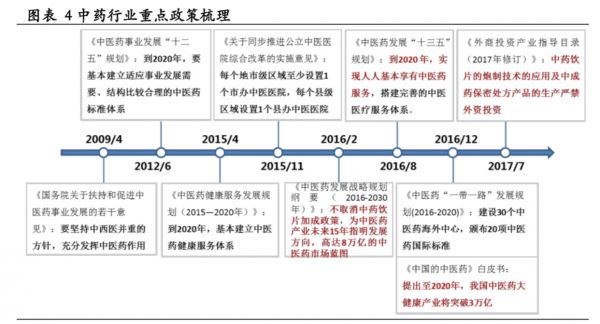 在国内,为促进中医药事业的发展,推进国内医药中西医并举,行业发展政策开始密集出台——据基业常青研究院统计,自2009年至2018年3月,国家共颁布36项中医药政策,并在9次国家级会议上提出支持发展中医药的政策建议。