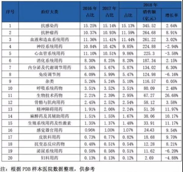 从样本医院销售市场规模超过100亿的治疗大类来看,抗肿瘤药增速最快,达到8.91%。